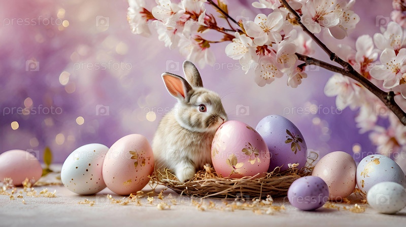 Нежные пасхальные яйца, белый кролик и вишневые ветви на фоне пастельного акварели с нежными полосками