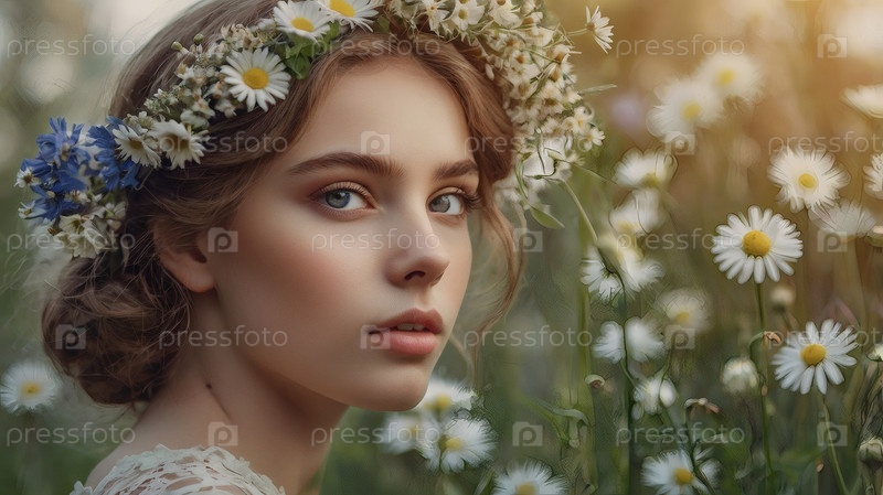 Красивая девушка с венком ромашки и кукурузных цветов на голове в поле. День святого Петра и Февронии. Всероссийский день семьи, любви, верности
