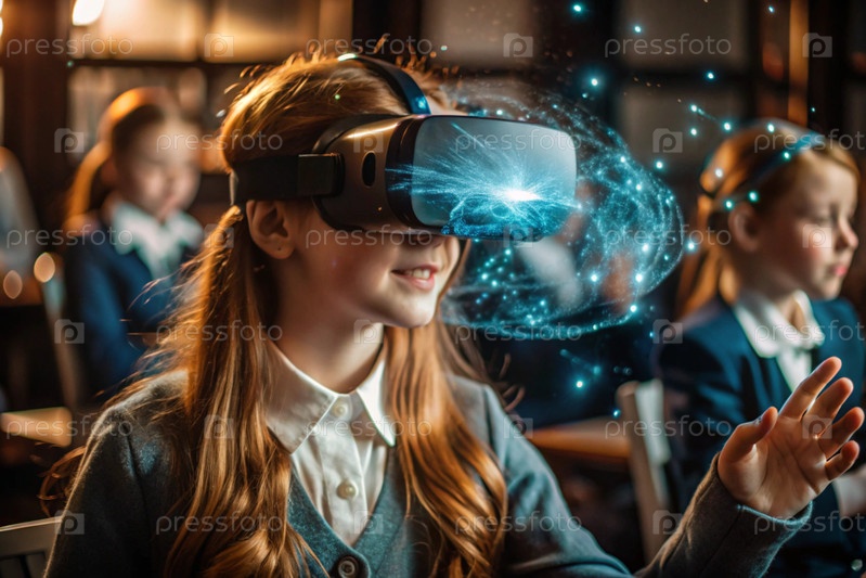 Девочка с очками виртуальной реальности. Ребенок находится в классе, а другие ученики на заднем плане. Цифровой интерфейс отображается в наушниках