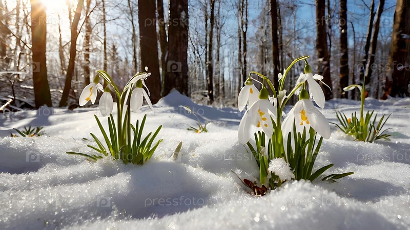 Первые весенние цветы.Белые снегопады в лесу крупный план на утреннем солнце.Весна