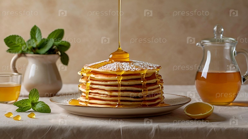 Вкусные блины с медом и листьями мяты на стильной тарелке в бежевой кухне.Концепция российского праздника Масленицы