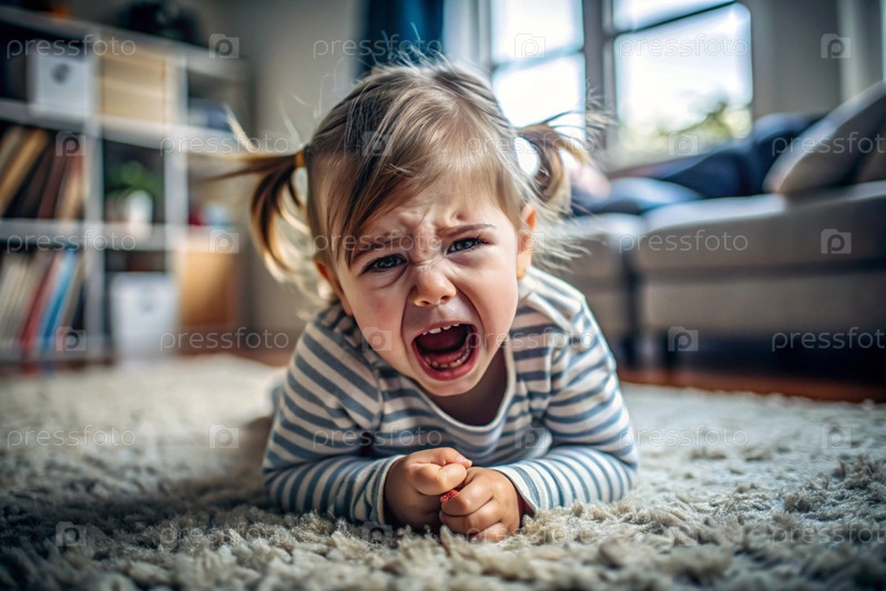 Маленькая девочка лежит на полу. Детская истерия. Ребенок кричит, плачет, становится капризным и истеричным. Недовольство