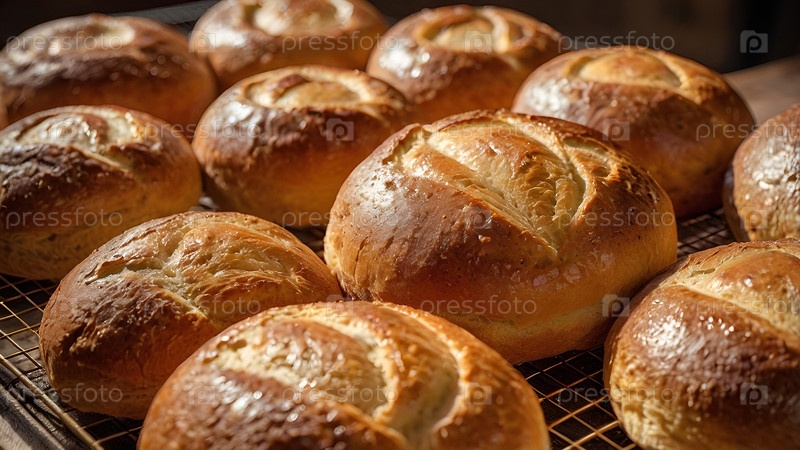 Печьте хлеб на фабрике. Свежий вкусный хлеб в пекарне. Свежевыпеченный кисломолочный хлеб с золотой корой на фабрике. Контекст пекарни со вкусным хлебом