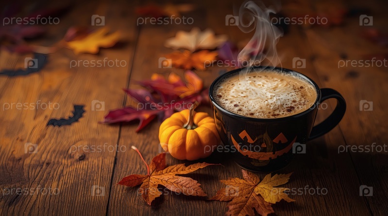 Хэллоуин. тыква, осенние листья и чашка кофе на столе. вид сверху, деревянная поверхность