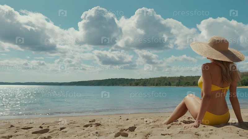 Женщина на отдыхе, сидящая в купальнике и соломенной шляпе с широкими краями на пляже в солнечный день и смотрящая на море