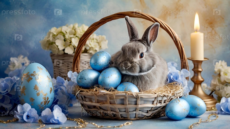 Нежные пасхальные яйца, серый кролик и голубые цветы гортензии на пастельном акварельном фоне с нежными венами