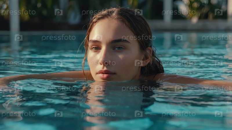 Близко. красивая молодая женщина в бирюзовом бассейне. концепция здорового образа жизни, отдых, расслабление, туризм, косметические спа-процедуры в курорте красота, гордость