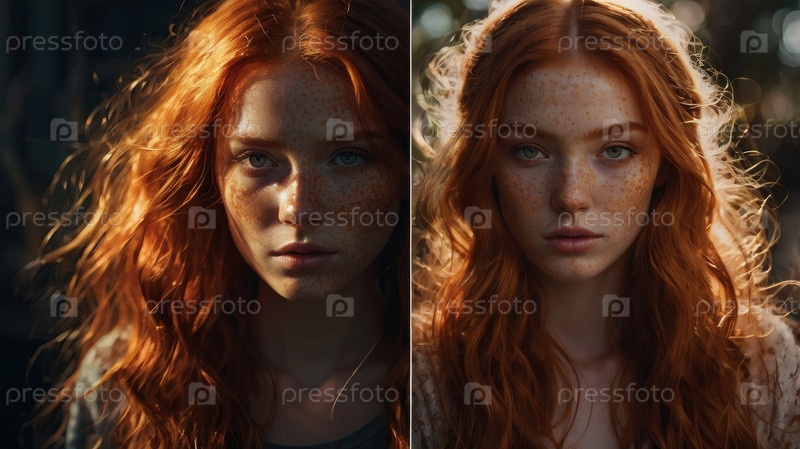 Портрет красивой рыжеволосой девушки с кудрявыми волосами и веснушками на лице в солнечном свете