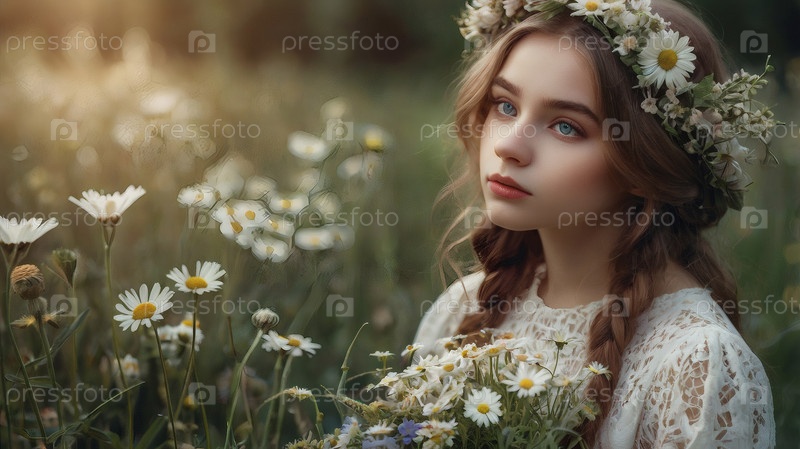 Красивая девушка с венком ромашки и кукурузных цветов на голове в поле. День святого Петра и Февронии. Всероссийский день семьи, любви, верности