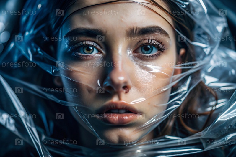 Девочка завернута в целлофан или сумку. Девушка задыхается. Пластиковое загрязнение планеты. Опасность для окружающей среды. Сокращение повторного использования пластика. Переработка. Концепция мусора