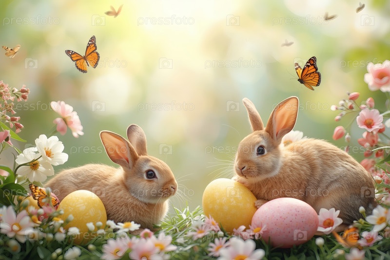 Пасхальные кролики лежат на пасхальных яйцах и смотрят в камеру
