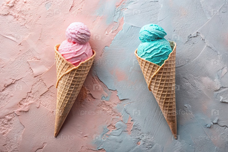 Баннер.Сладкий десерт.Конусы мороженого с разными вкусами.Голубое, розовое мороженое на фоне двух пастельных цветов: синего и розового