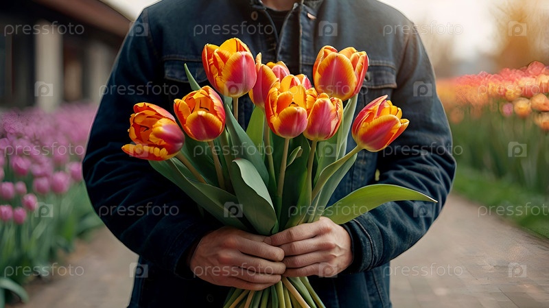 Баннер. Мужские руки с красивым букетом тюльпанов. Поздравительная открытка на 8 марта и Международный женский день. Концепция поздравлений и празднований