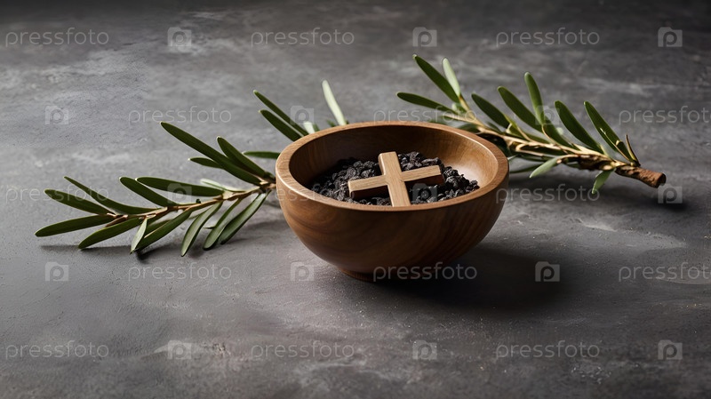 Религия, вера, литургия, Пепельная среда.Огромное заимствование: деревянный крест, церемониальная пепла и оливковая ветвь на сером фоне