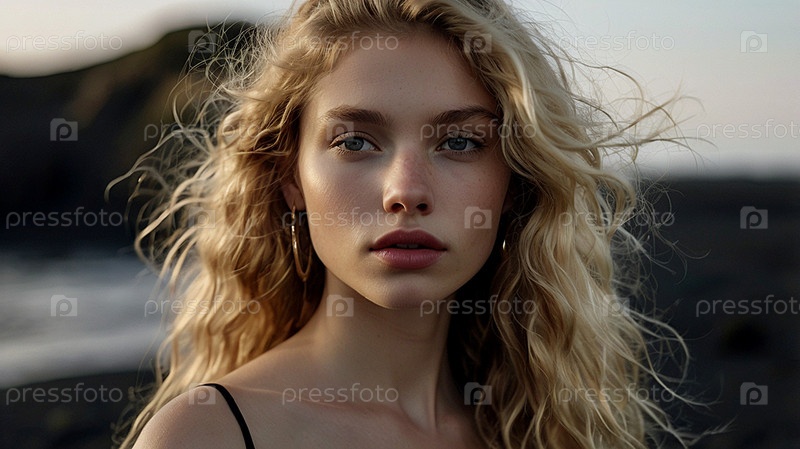 Портрет красивой женщины на пляже с черным песком против моря.Романтическая, спокойная и чувственная фотография девушки в нежном чёрном платье