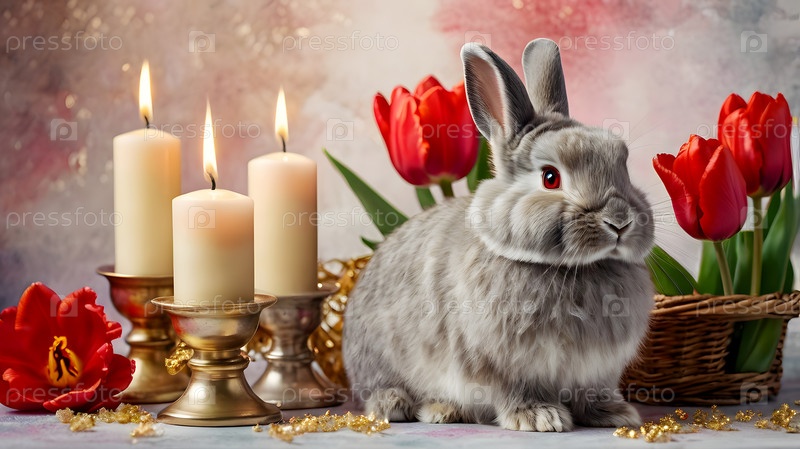 Концепция ярких пасхальных праздников - яркие пасхальные яйца в корзине из колючки, кролик и красные цветы на пастельном фоне воды