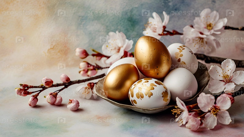 Нежные пасхальные яйца и вишневые ветви цветут на пастельном акварельном фоне с нежными полосками