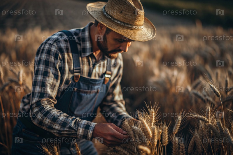 Фермер-мужчина держит золотые колосья пшеницы на фоне созревающего поля. Близкий план фермера. Концепция посадки и сбора богатого урожая. Сельский пейзаж при закате солнца