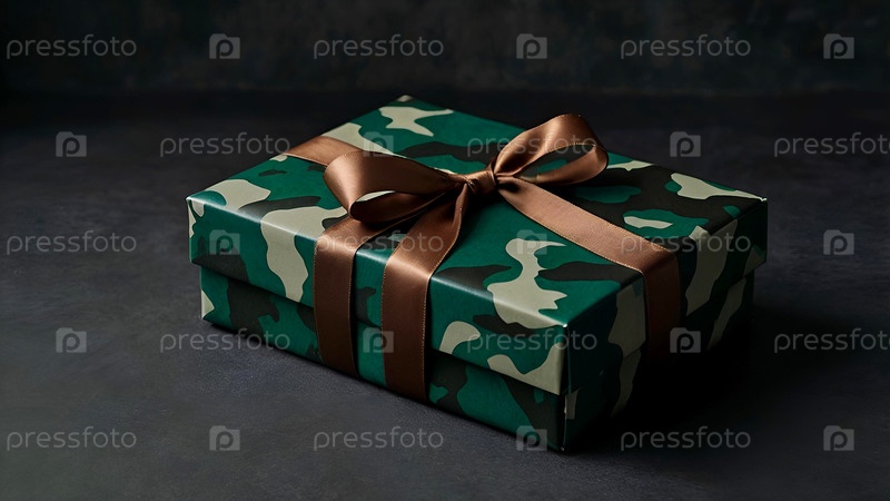 Концепция Дня защитника Отечества 23 февраля.Подарок камуфляжной коробки с праздничной сатинной лентой лука на тёмно-зеленом фоне
