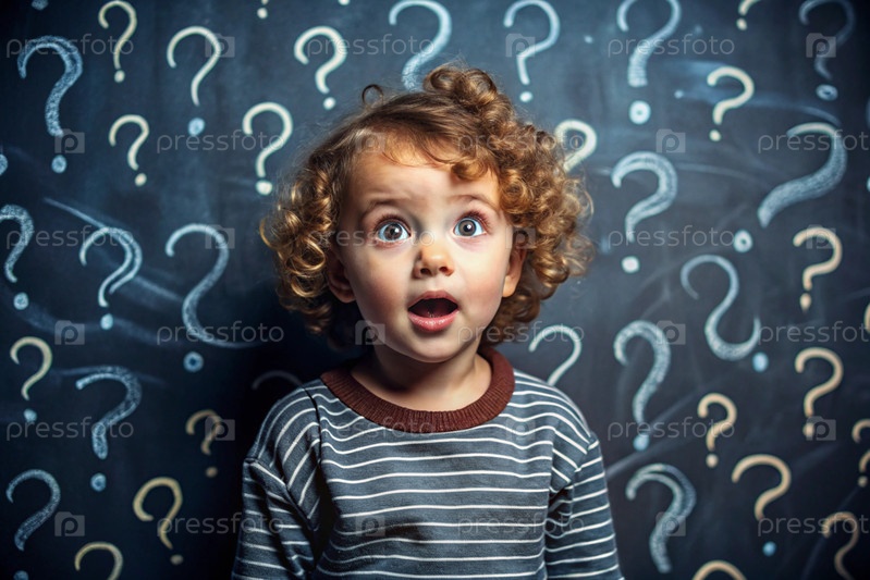 Развитие и образование детей. удивленный мальчик на темном фоне с вопросительными знаками. мозговой штурм, вопросы детей и концепция идеи