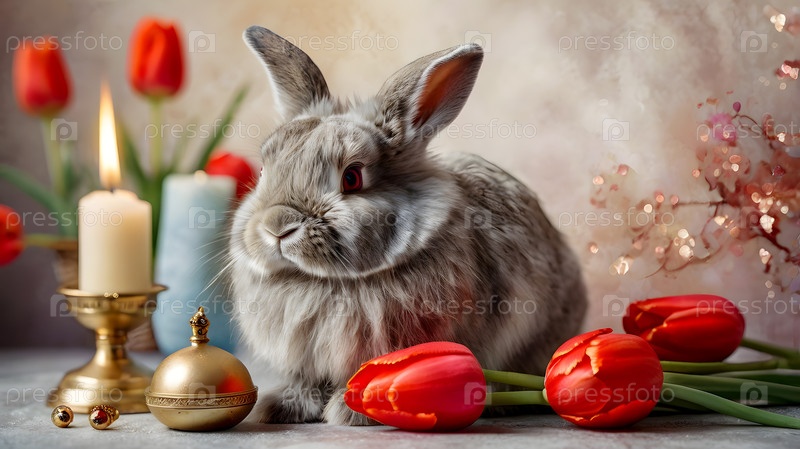 Концепция ярких пасхальных праздников - яркие пасхальные яйца в корзине из колючки, кролик и красные цветы на пастельном фоне воды