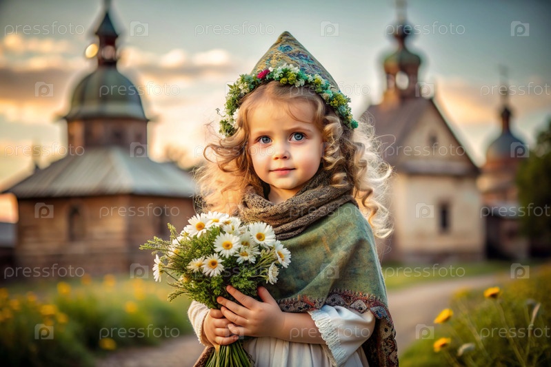 Всероссийский День семьи, любви и верности Красивая маленькая кудрявая девочка с букетом ромашек на фоне Православной церкви День святого Валентина Петра и Февронии