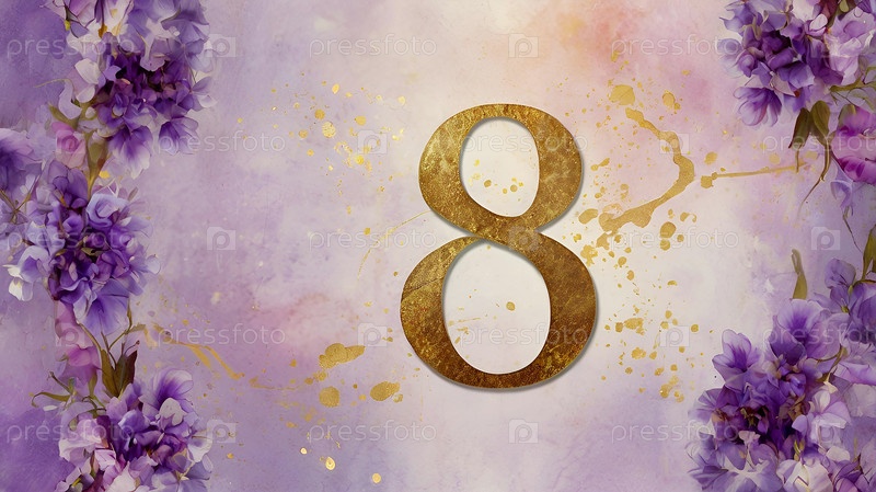 Международный женский день. праздник приходится на 8 марта. баннер, флаер. торжественный, нежный фиолетовый цветочный фон номер 8