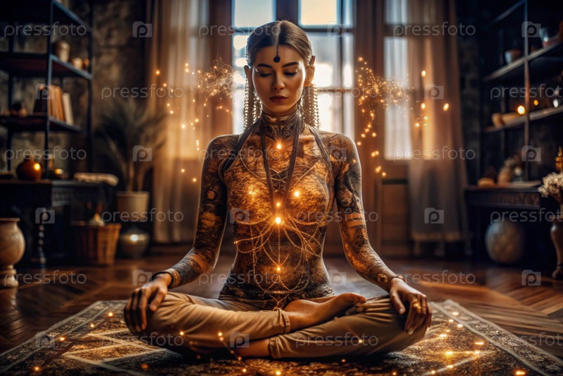 Концепция эзотерической духовной медитации, женщина в позе лотоса.Человеческая медитация, духовность и активация чакр, мистический дух