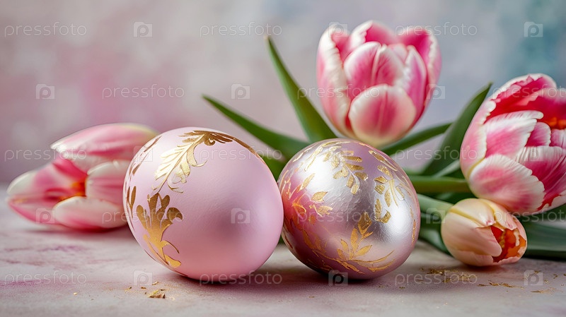 Нежные пасхальные яйца в розовых, золотых и фиолетовых тонах и цветы тюльпанов на пастельном акварельном фоне с деликатными венами