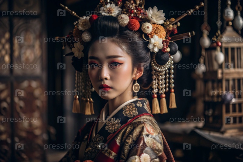 Японская девушка в традиционном национальном костюме - кимоно. На фоне домов, фонарей и вишневых деревьев портрет символизирует традиции и культуру народа Японии