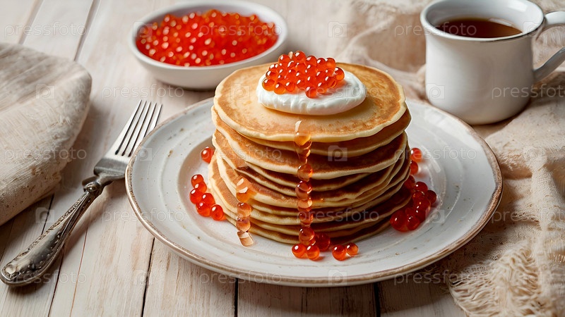 русские традиции. российский праздник Масленица. натюрморт с кучей блинов и красной икры на светло-бежевом фоне