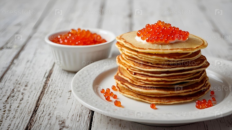 русские традиции. российский праздник Масленица. натюрморт с кучей блинов и красной икры на светло-бежевом фоне