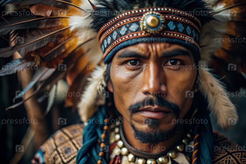 Красивый мужской портрет индейца, вождя племени в пернатом головном уборе