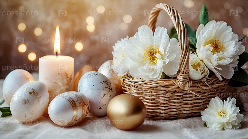 Нежные пасхальные яйца в жемчужной корзине и нежные цветы на пастельно-водном фоне