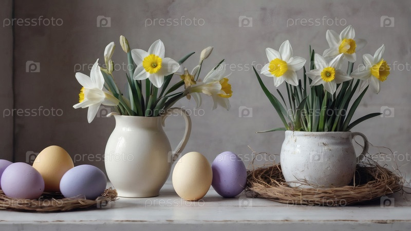 Концепция яркого пасхального праздника. Ретро интерьер дома с пасхальным декором. Весенние цветы в белой вазе и пасхальные яйца в пастельных оттенках