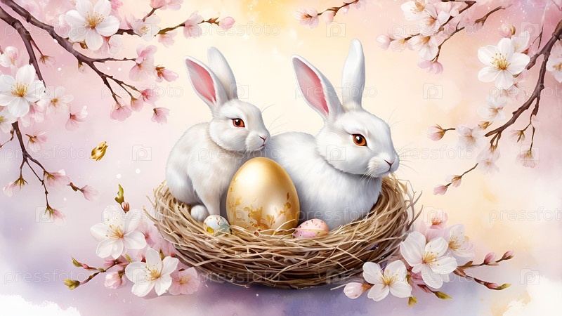 Нежные пасхальные яйца, белый кролик и вишневые ветви на фоне пастельного акварели с нежными полосками