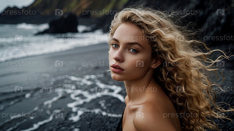 Портрет красивой женщины на пляже с черным песком против моря.Романтическая, спокойная и чувственная фотография девушки в нежном чёрном платье