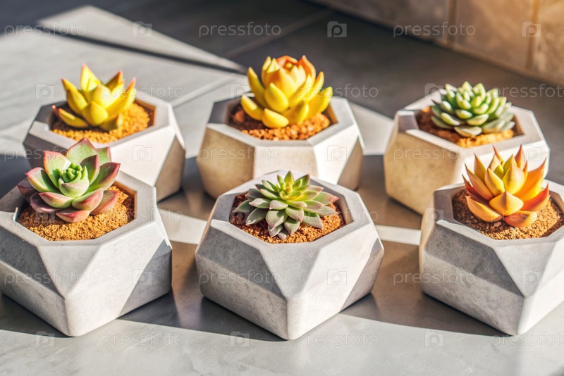Группа миниатюрных сочных цветов в керамическом горшке в форме дома на подоконнике. Закрывая зеленые вершины растения эчеверия. Цветущие комнатные растения. Суккуленты
