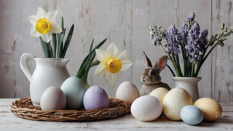 Концепция яркого пасхального праздника. Ретро интерьер дома с пасхальным декором. Весенние цветы в белой вазе, кролики и пасхальные яйца в пастельных оттенках