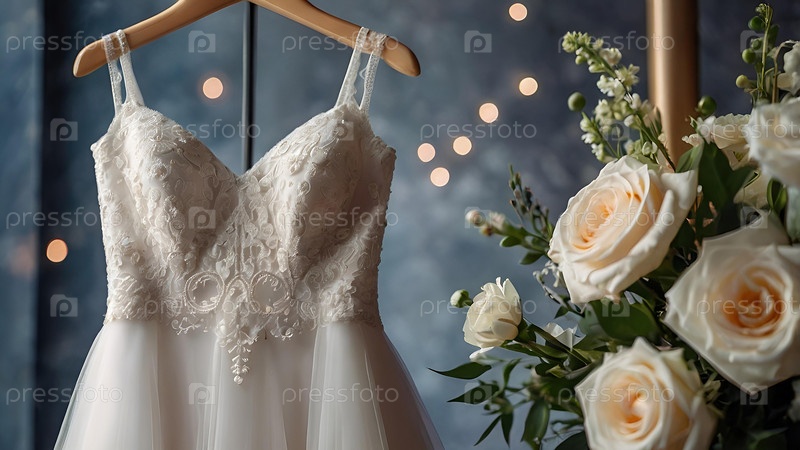 Близко. Элегантное белое свадебное платье на вешалке и букет цветов. Утро невесты. Аренда и покупка свадебных платьев для мероприятий