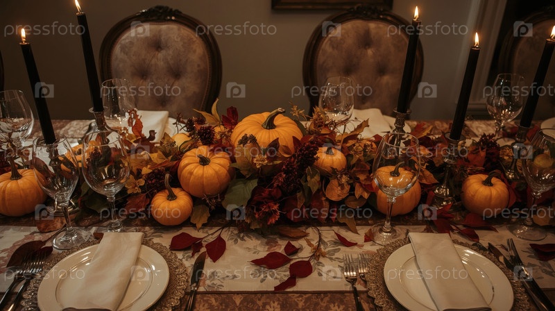 Красивый осенний стол с яркими тыквами, цветами и блюдами. Праздничная идея для осени, Хэллоуина или Дня благодарения