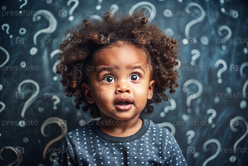 Развитие и образование детей. удивленная афроамериканская чернокожая девушка на темном фоне с вопросительными знаками. мозговой штурм, вопросы детей и концепция идеи