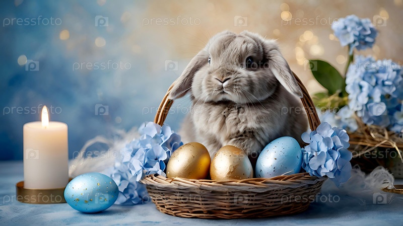 Нежные пасхальные яйца, серый кролик и голубые цветы гортензии на пастельном акварельном фоне с нежными венами