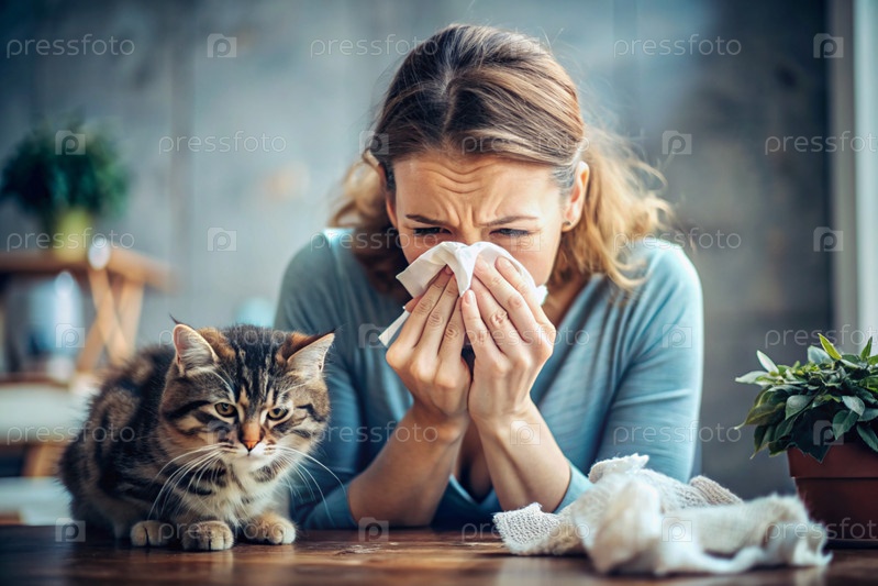 Женщина чихает в белую салфетку дома. Аллергия на волосы кошек и домашних животных. Рядом со мной кот