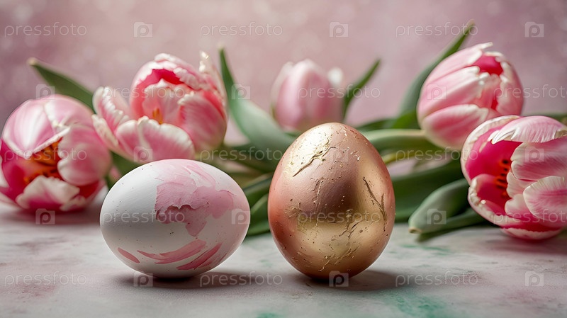 Нежные пасхальные яйца в розовых, золотых и фиолетовых тонах и цветы тюльпанов на пастельном акварельном фоне с деликатными венами
