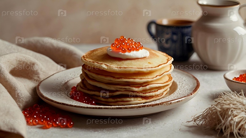 русские традиции. российский праздник Масленица. натюрморт с кучей блинов и красной икры на светло-бежевом фоне