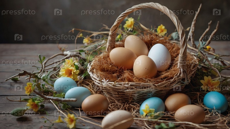 Концепция яркого пасхального праздника.Нежные деревенские пасхальные яйца в плетеновой корзине