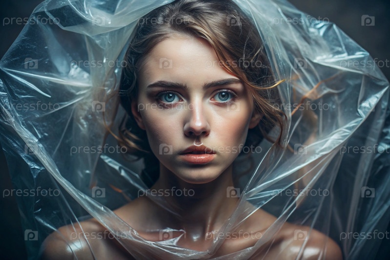 Девочка завернута в целлофан или сумку. Девушка задыхается. Пластиковое загрязнение планеты. Опасность для окружающей среды. Сокращение повторного использования пластика. Переработка. Концепция мусора