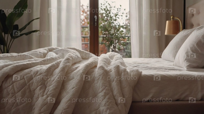 Интерьер современного дома.Минималистский уютный бежевый интерьер спальни с клеткой, подушками, головной доской, полотном и ночным столом