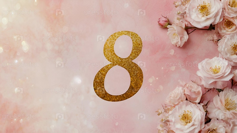 Международный женский день. праздник приходится на 8 марта. баннер, флаер. торжественный, нежный розовый цветочный фон с номером 8